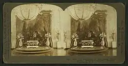 Public weddings in the White House, particularly those of the president's children, "have been feel-good occasions for the country and the commander in chief, casting presidents in the sympathetic role of father."[2] President-elect Richard Nixon encouraged his daughter, Julie, and her fiancé, David Eisenhower, grandson of Dwight D. Eisenhower, to postpone their December 1968 wedding at New York's Marble Collegiate Church and instead have it after his inauguration at the White House, but the couple did not wish for the publicity of a White House wedding.[3] Her older sister, Tricia, is the most recent White House bride to be a child of the president.