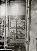 1750–1941 | The synagogue building was a wooden structure built on a stone foundation. The walls of were cut from edged logs into a clean corner. The central log house was dominant in height, to which side log houses were adjoined as covered galleries. A pentagonal structure was added to the main facade, which covered the main entrance. The building was covered with a high gable roof, with a complex plan and numerous outbuildings. In the end of 19th - beginning of 20th century the roof was covered with tin.[6] The interior was almost entirely covered with magnificent polychromes made in 1745 by the Słuck painter Chaim ben Yitzchak ha-Levi Segal. Murals, made on boards, represented the images of 12 signs of the zodiac, mythical animals and cities. Some researchers noted that under the image of mythical cities features of Mogilev from the times of the Polish-Lithuanian Commonwealth were visible. These murals were studied by El Lissitzky and Issachar Ber Ryback. | ![]() ![]()
