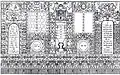 It consisted of a square (12 × 12 m) large main hall. The walls were 6 m high; it was 10.20 m to the highest point of the vault, and the floor was a few steps lower than the outer rooms. On the west side there was a vestibule and above it a gallery with arcades. A two-story corner pavilion stood to the right and left. The north and south sides were flanked by women's dreams. The main building had a three- story tent roof, with the upper step transitioning to an octagonal point. The corner pavilions had a two-story roof. Inside, four wooden pillars supported the vault; they divided the floor plan into nine equally sized fields. In the middle stood the bima; it was in the shape of an octagonal arbor with a canopy with a crown on the top. | ![]()