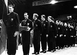 Lithuania was granted the right to organize the EuroBasket 1939. In addition, the Kaunas Sports Hall, Europe's first dedicated basketball arena, was built. In the competition, the team roster mostly consisted of Lithuanian Americans, with five American-born players: the returning Feliksas Kriaučiūnas (Chicago), Juozas Jurgėla (Chicago), Vytautas Budriūnas (Waukegan), Mykolas Ruzgys and Pranas Lubinas (Glendale). As a result, there were several protests from other nations.[21] Lubinas, who was the designated player-coach, lead Lithuania to a second continental title, even scoring the buzzer-beater in the decisive game against Latvia, which warranted a 37–36 victory.[22]