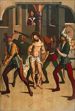 In contrast to earlier interpretations stating that the picture portrayed Christ before Caiaphas, according to Jan Royt[15] it is in fact the theme of Christ before Annas (according to St John's Gospel), because Caiaphas is usually shown in a robe torn at the chest or with a mitre (Giotto, Dürer). A group of armed men with torches has brought Christ, his hands tied, and turn to the enthroned high priest with gestures of their arms and hands. The panel is damaged, having been cut down to a smaller size; it is consequently missing most of the figure holding the rope. Christ looks back at a man holding a lamp with a burning candle – this man with a lamp is modelled on an engraving by Martin Schongauer. The men surrounding Christ are wearing short tunics and close-fitting leggings typical of Renaissance fashion in the early 16th century. Christ's long robe partially indicates the volume of his body. A view through to the street beyond shows a group of armed men in front of whom an old man, probably St Peter, is crossing.[15]