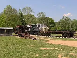 The Little River Railroad and Lumber Company Museum in Townsend, Tennessee. The red machine on the left is a logging skidder, used to load logs onto flat cars. A 70-ton Shay engine, used to pull a typical logging railroad, is in the back in the center. A railroad flatcar, which carried the logs, is on the right.