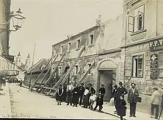 At the time, Ljubljana's population was some 31,000, with around 1,400 buildings.[1] The earthquake directly caused 21 death casualties,[1] two people died later while clearing the rubble and three children died several days after the earthquake due to the severe cold in their temporary accommodation. The lack of food, poor living conditions and rainy weather meant that diseases, especially diphtheria, spread rapidly. The elderly and children in particular were dying.[6]