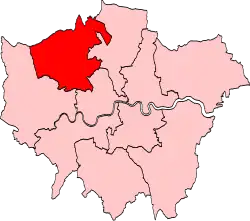 When it was created in England in 1979, it consisted of the Westminster Parliament constituencies of Brent East, Brent North, Brent South, Chipping Barnet, Harrow Central, Harrow East, Harrow West, Hendon North and Hendon South.[1] United Kingdom Parliamentary constituencies were redrawn in 1983 and the European constituencies were altered to reflect this. The new seat comprised the following Westminster constituencies: Brent East, Brent North, Brent South, Harrow East, Harrow West, Hayes and Harlington, Ruislip-Northwood and Uxbridge.[2] These boundaries were used in 1984, 1989 and 1994.[3][4]
