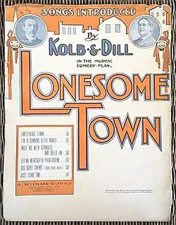Lonesome Town is a musical in two acts with music by J. A. Raynes and both book and lyrics by Judson D. Brusie.[1] Set in the fictional boomtown of Watts, California in 1902, the musical's comedy of errors plot centered around competing claimants to valuable real estate in the city. The musical was created as a starring vehicle for the comedy duo Kolb and Dill.[2] It premiered at the Central Theatre in San Francisco in September 1906. A successful road musical, it toured the United States for several years.[3] This tour included a run at Broadway's Circle Theatre where it played for 88 performances from January 20, 1908, through April 4, 1908.[2]