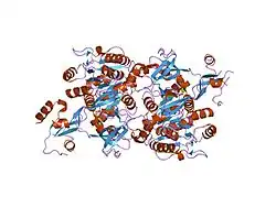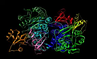 8. ^ May JJ, Kessler N, Marahiel MA, Stubbs MT (September 2002). "Crystal structure of DhbE, an archetype for aryl acid activating domains of modular nonribosomal peptide synthetases". Proc. Natl. Acad. Sci. U.S.A. 99 (19): 12120–5. Bibcode:2002PNAS...9912120M. doi:10.1073/pnas.182156699. PMC 129408. PMID 12221282.