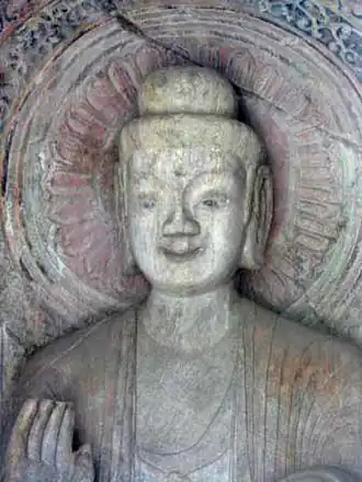There are several major grottoes with notable displays of Buddhist sculptures and calligraphic inscriptions.[3][5] Some of the main caves and the year when work began within them include: Guyang-dong (493), Binyang-dong (505), Lianhua-dong (520s), Weizi-dong (522), Shiku-si (520s), Weizi-dong (520s), Shisku (520s), Yaofang-dong (570), Zhaifu-dong (ca. 636), Huijian-dong (630s), Fahua-dong (650s), Fengxian-si (672), Wanfo-si (670-680s), Jinan-dong (684), Ganjing-si (684), and Leigutai-dong (684).[12] The Guyang, Binyang, and Lianhua caves are horseshoe-shaped.[13]
