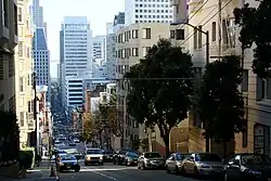 Looking Down Sacramento St., 1906. [verso:] "San Francisco: April 18, 1906." From As I Remember by Arnold Genthe: This photograph shows "the results of the earth quake, the beginning of the fire and the attitude of the people."[1]: 94 It was taken the morning of the first day of the fire. Shows Sacramento St. at Miles Place (now Miller Place) near Powell St.[2]