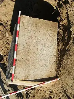 Season VII (2015) – During excavation of the eastern cryptoporticus of the forum, a pedestal appeared, dedicated by the cavalry officer Quintus Sempronius Vitulus to the Emperor Tiberius,[37] in his fifth consulate (31/32 AD).[38][39] A second pedestal, found in the same area as the first, was dedicated to Lucius Caesar,[40][41] adopted son of the Emperor Augustus. It can be dated to between 5 BC and 2 AD.[42][43] A third pedestal in the same area, dedicated by a freedman to the same Quintus Sempronius Vitulus, described his military career[44] as an officer in the Taurian wing and subprefect of a cohort in the cohors Germanorum.[45] A fourth pedestal practically identical to the previous one was also found,[46] although on this occasion the name of the dedicator of the monument was complete, the freedman Aesopus[47] and, unlike the previous one, which was made by Vitulus himself in his will, this was erected by Aesopus on his own initiative.[48]