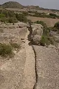 The elevated section of this aqueduct was complemented by sections of specimens carved into the rock itself - some meters of this system have been found-, taking advantage of the slope of some hills, maintaining the necessary level and with the appropriate slope for the continuity of the water transit. Taking into account the dimensions to which the different elements of the route are located, it has been calculated that the entire aqueduct maintained a constant slope of less than 0.1% -a meter of difference for each kilometer of travel-, which makes a difference of height between pillars of a few millimeters. There is a local legend that attributes the construction of the aqueduct to the Devil.[59]
