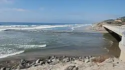 Most of the freshwater entering the Los Peñasquitos Lagoon arrives from Los Peñasquitos Canyon via Los Peñasquitos Creek.[12][13] For many years, the Los Peñasquitos Lagoon had evolved from a tidal estuary to a lagoon that was closed to tidal action for long periods of time. Since becoming a part of the State Park System, there have been a number of changes that have increased the tidal action within the lagoon.