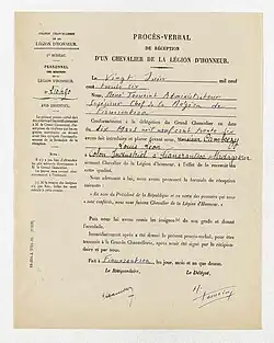 Minutes of the reception of Louis Cambrézy as Chevalier of the Legion of Honour