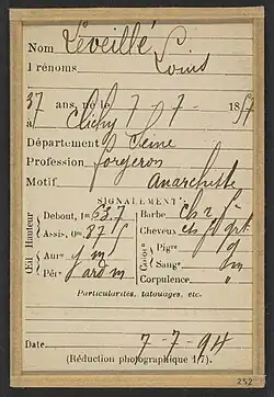 - ^ Bertillon, Alphonse (1894), Leveillé. Louis. 37 ans, né le 7/7/57 à Cliche (Seine). Forgeron. Anarchiste. 7/7/94., retrieved 2025-07-18