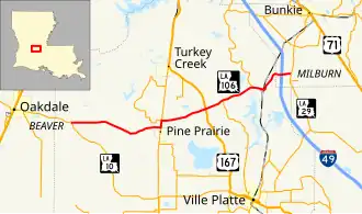 Louisiana Highway 106 (LA 106) is a state highway located primarily in Evangeline Parish that runs 24.2 miles (38.9 km) in a west–east direction from LA 10 east of Oakdale to LA 29 south of Bunkie.[1] Along the way, LA 106 passes through the towns of Pine Prairie and St. Landry and intersects U.S. Highway 167 (US 167). Near the east end of its route, LA 106 passes through an interchange with Interstate 49 (I-49) between Opelousas and Alexandria in the southwest corner of Avoyelles Parish.