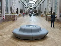 New arrangements after the war revealed the further evolution of taste away from the lavish decorative practices of the late 19th century. In 1947, Edmond Guillaume's ceiling ornaments were removed from the Salle des Etats,[60] where the Mona Lisa was first displayed in 1966.[67] Around 1950, Louvre architect Jean-Jacques Haffner streamlined the interior decoration of the Grande Galerie.[60] In 1953, a new ceiling by Georges Braque was inaugurated in the Salle Henri II, next to the Salle La Caze.[68] In the late 1960s, seats designed by Pierre Paulin were installed in the Grande Galerie.[69] In 1972, the Salon Carré's museography was remade with lighting from a hung tubular case, designed by Louvre architect Marc Saltet with assistance from designers André Monpoix, Joseph-André Motte and Paulin.[70]