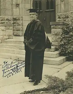They moved to Columbia, Missouri in the summer of 1893 where both Franklin and Luella were interviewed for the position of president of Christian Female College, another school affiliated with the Christian Church (Disciples of Christ).[4] William S. St. Clair came with them from Colorado and was hired as a teacher of philosophy and religion.[5] Franklin died on November 21, 1893, and the trustees of Christian Female College then, as had been prearranged, appointed Luella St. Clair to the college presidency. She was one of the first women in the U.S. to be appointed a college president. Her goal was to make her college the "Vassar of the West" and insisted that the students use the academic cap and gown as the official uniform rather than the traditional Christian College bonnets.[4]