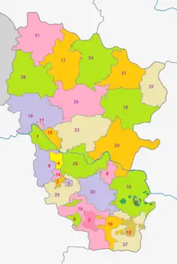 Cities of republican significance: 1 Alchevsk, 2 Antratsit, 3 Bryanka, 4 Kirovsk, 5 Krasnodon, 6 Krasny Luch, 7 Lisichansk, 8 Lugansk, 9 Pervomaysk, 10 Rovenki, 11 Rubezhnoye, 12 Sverdlovsk, 13 Severodonetsk, 14 Stakhanov. Districts: 15 Antratsitovsky, 16 Belovodsky, 17 Belokurakinsky, 18 Krasnodonsky, 19 Kremenskoy, 20 Lutuginsky, 21 Markovsky, 22 Melovsky, 23 Novoaydarsky, 24 Novopskovsky, 25 Perevalsky, 26 Svatovsky, 27 Sverdlovsky, 28 Slavyanoserbsky, 29 Stanichno-Lugansky, 30 Starobelsky, 31 Troitsky.