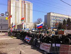 One thousand pro-Russian activists seized and occupied the Security Service of Ukraine (SBU) building in the city of Luhansk on 6 April 2014, following similar occupations in Donetsk and Kharkiv.[29][30] The activists demanded that separatist leaders who had been arrested in previous weeks be released.[29] In anticipation of attempts by the government to retake the building, barricades were erected to reinforce the positions of the activists.[31][32] It was proposed by the activists that a "Lugansk Parliamentary Republic" be declared on 8 April 2014, but this did not occur.[33][34] By 12 April, the government had regained control over the SBU building with the assistance of local police forces.[35]
