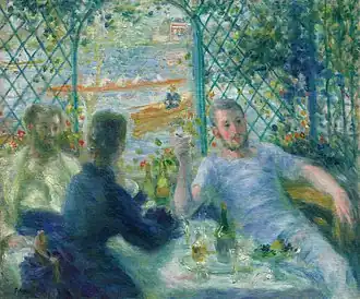 Lunch at the Restaurant Fournaise, also known as The Rowers' Lunch, Déjeuner chez Fournaise, or Déjeuner au Restaurant Fournaise, is a 1875-1879 painting by Pierre-Auguste Renoir. It portrays three people having lunch at the Maison Fournaise located on the Île des Impressionnistes in the River Seine at Chatou, west of Paris. A rower and a coxed four are portrayed outside the restaurant, boating on the river.[1]