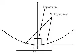 At each step, the LJ heuristic maintains a box from which it samples points randomly, using a uniform distribution on the box. For a unimodal function, the probability of reducing the objective function decreases as the box approach a minimum. The picture displays a one-dimensional example.