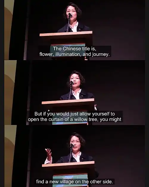 At the world premiere, Flora Lau explains that "‘Luz’ is the Latin word for light, but it’s not light that is coming from your light bulb. It’s organic, universal light that connects us all.” And, the words in the Chinese title "花明渡" mean "flower (花; huā), illumination (明; míng), and journey (渡; dù)". The first two words "花明" are borrowed from a famous ancient Chinese poem by Lu You from Song Dynasty.[18]