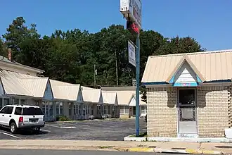 The Lynwood Tourist Court Historic District encompasses a historic tourist accommodation, now known as the Lynwood Motel, at 857 Park Avenue in Hot Springs, Arkansas, United States. Built about 1944, it is a little-altered example of a 1940s traveler accommodation with English Revival styling. It has sixteen units, each of which originally included a garage (now enclosed to create additional living space), and a small office building. Each unit includes a sleeping area, bathroom, and kitchenette, and is marked on the exterior by a steeply pitched gable.[2]