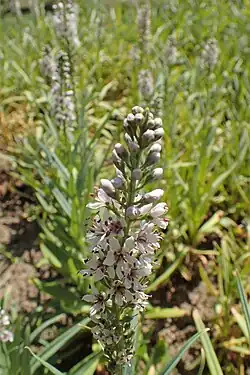 Lysimachia ephemerum, the willow-leaved loosestrife or milky loosestrife,[1] is a species of flowering plant in the primrose family Primulaceae, native to France, Spain, Portugal and Morocco.[2] Against grey-green foliage this hardy herbaceous perennial bears erect racemes of delicate white flowers with purple stamens on 1 m (3.3 ft) stems in early summer. It is cultivated as an ornamental plant, and holds the Royal Horticultural Society's Award of Garden Merit.[3] It requires a position in full sun, and reliably moist soil.