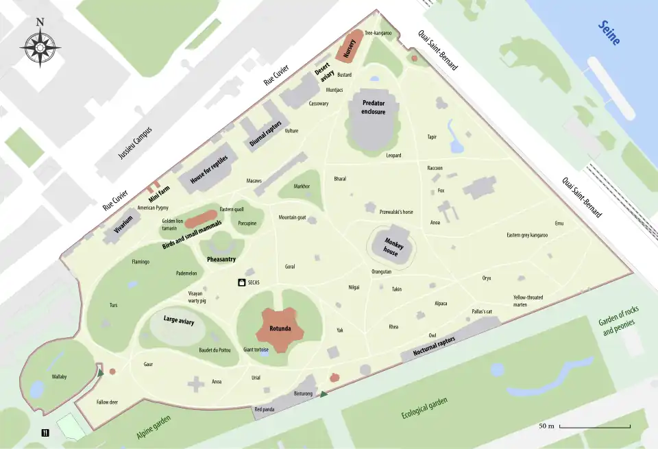 The zoo is located directly by the Seine in the centre of Paris. It takes up about one third of the Jardin des Plantes.