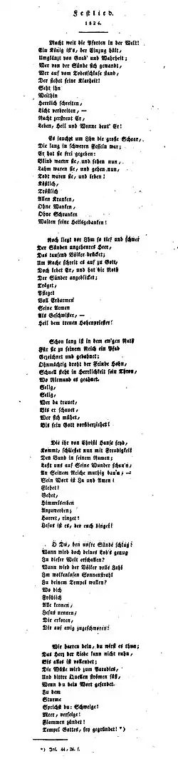 The poem appeared also in Johann Peter Lange's hymnal in 1843, in the Jauersches Gesangbuch in Breslau in 1855, in an Oldenburg hymnal and the Schlesisches Gesangbuch both in 1868, among others.[3] In 1938, it became part of the hymnal Kirchenlied with a melody by Adolf Lohmann.[4] It was one of the Christköniglieder, proclaiming Christ the King in opposition to the Nazi regime.[5]