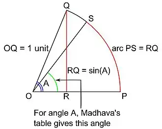 Consider some angle whose measure is A. Consider a circle of unit radius and center O. Let the arc PQ of the circle subtend an angle A at the center O. Drop the perpendicular QR from Q to OP; then the length of the line segment RQ is the value of the trigonometric sine of the angle A. Let PS be an arc of the circle whose length is equal to the length of the segment RQ. For various angles A, Madhava's table gives the measures of the corresponding angles POS in arcminutes, arcseconds and sixtieths of an arcsecond.