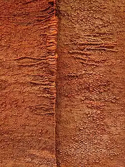 Each Abakan is made out of woven material using Abakanowicz's own technique. The material used for many of these pieces was found, often collecting sisal ropes from harbors, intertwining them into threads and dying them.[22] She also used "rope, hemp, flax, wool and horsehair."[11] Hung from the ceiling, Abakans reach sizes as large as thirteen feet with sometimes only a few inch clearance from the ground. The Abakans often incorporated reproductive references to eggs and the womb.[5]