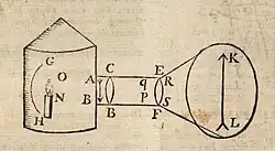 Dutch scientist Christiaan Huygens is considered as one of the possible inventors of the magic lantern. He knew Athanasius Kircher's 1645 edition of Ars Magna Lucis et Umbrae[22] which described a primitive projection system with a focusing lens and text or pictures painted on a concave mirror reflecting sunlight. Christiaan's father Constantijn had been acquainted with Cornelis Drebbel who used some unidentified optical techniques to transform himself and to summon appearances in magical performances. Constantijn Huygens wrote about a camera obscura device that he got from Drebbel in 1622.[16]