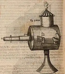 Several types of projection systems existed before the invention of the magic lantern. Giovanni Fontana, Leonardo da Vinci and Cornelis Drebbel described or drew image projectors that had similarities to the magic lantern.[14] In the 17th century, there was an immense interest in optics. The telescope and microscope were invented and apart from being useful to some scientists, such instruments were especially popular as entertaining curiosities to people who could afford them.[15] The magic lantern would prove a natural successor.