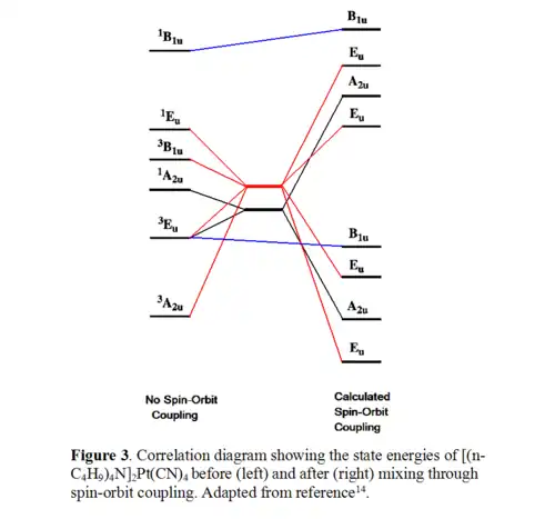 Mixing of all these singlet and triplet states will occur and is attributed to the spin orbit coupling of platinum 5d orbitals (ζ ~ 3500 cm−1), as shown in figure 3. The black lines on the figure indicate the mixing of 1A2u with 3Eu to give two A2u states. The red lines show the 1Eu, 3Eu, 3A2u, and 3B1u states mixing to give four Eu states. The blue lines indicate remnant orbitals after spin-orbit coupling that are not a result of mixing.