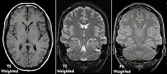 Examples of T1-weighted, T2-weighted and PD-weighted MRI scans