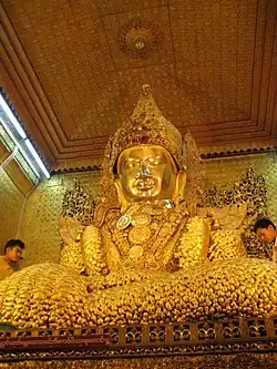 The Mahamuni Buddha Temple (Burmese: မဟာမုနိရှင်တော်မြတ်ကြီး, Burmese pronunciation: [məhà mṵnḭ pʰəjádʑí]) is a Buddhist temple and major pilgrimage site, located southwest of Mandalay, Myanmar (Burma).[1] The Mahamuni Image (lit.'The Great Sage') is enshrined in this temple, and originally came from Arakan.[2] It is highly venerated in Burma and central to many people's lives, as it is seen as an expression of representing the Buddha's life.[3]