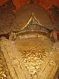 The Mahamuni Buddha image is housed in a small gandhakuṭi chamber, seated on a throne in a divine posture known as the Bhumisparsa Mudra. This posture or mudra symbolises Buddha's vanquishing of Mara). The legs are crossed with feet turned inwards, and the right hand touches the ground ritualistically, as a witness of his past deeds.[11] The image is cast in bronze and weighs 6.5 tonnes and is erected on a 1.84 metres (6.0 ft) high pedestal and reaches a height of 3.82 metres (12.5 ft).[11][27] Its shoulders measure 1.84 metres (6.0 ft) and its waist measures 2.9 metres (9.5 ft).[11][27] It is draped in royal costumes with "Brahmanic cords (salwe) and regalia crossing his chest".[27] The image is crowned, bejewelled with diamonds, rubies and sapphires. The left hand appears imprecise, unusually large, and is seen resting in the lap with an upturned palm.