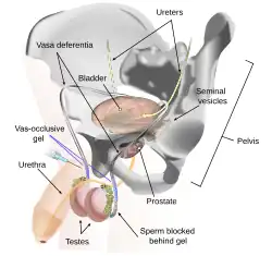 Vas-occlusive contraception provides a contraceptive effect through physical blockage of the vas deferens, the duct connecting the epididymis to the urethra. While a vasectomy excises, or removes, a piece of each vas deferens and occludes the remaining open ends of the duct, vas-occlusive methods aim to block the duct while leaving it intact. Vas-occlusive methods generally aim to create long-acting reversible options, through a second procedure that removes the blockage.[138] However, full reversibility remains questionable, since animal and human studies have shown sperm abnormalities, incomplete recovery of sperm parameters, and the development of fertility-impairing antibodies against one's own sperm after blockage removal.[110][139][140][141][142][143]