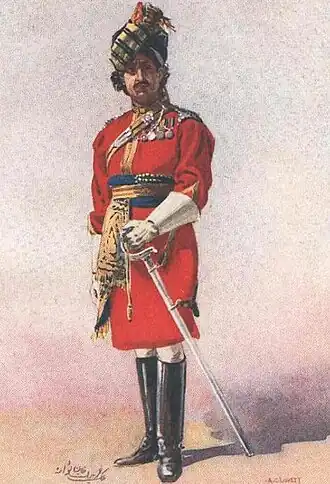 Sir Malik Umar Hayat Khan as an Honorary Lieutenant of the 18th King George's Own Lancers, early 20th century (watercolour by Major A.C. Lovett (1862–1919)).