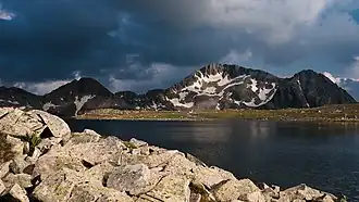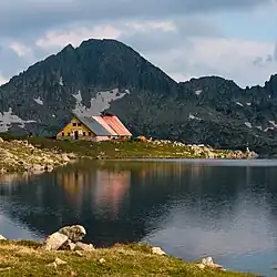 Tevnoto Lake is the largest and northernmost of the group, located in the immediate vicinity of the summits of Momin Dvor and Valyavishki Chukar.[4] It has an elongated curved shape slightly resembling a kidney. Reaching length of 487 m, width of 220 m and area of 62,490 m2, it is the eight largest lake in the mountain range and largest one in Bulgaria above 2,500 m. Its exact altitude is 2,519 m, which makes it the sixteenth highest lake in Pirin. The depth is 3.9 m; the water volume is 116,570 m3.[4][5] The homonymous Tevno Ezero shelter is situated near the out-flowing stream to the south.[4][6] Its natural beauty and majestic surroundings of rugged peaks make it a popular tourist destination.[6]