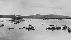 Following the outbreak of the Pacific War on 7 December 1941, as part of World War II the region was occupied by the Japanese. The Japanese attacked on 31 January 1942, landing at Hutu beach on the north coast, and Ritung beach in the south. They were opposed by soldiers of the KNIL and a small Australian contingent. The KNIL commander was captured the day after the attack, and the last defenders of the airfield were overcome a few days later.[26][27] The battle was followed by the summary execution of more than 300 Allied PoWs in the Laha massacre.