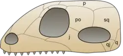 - Jaw joint – The dentary (the lower jaw bone, which carries the teeth) and the squamosal (a small cranial bone) meet to form the joint. In most gnathostomes, including early therapsids, the joint consists of the articular (a small bone at the back of the lower jaw) and quadrate (a small bone at the back of the upper jaw).[46]