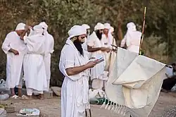 There are several indications of the ultimate origin of the Mandaeans. Early religious concepts and terminologies recur in the Dead Sea Scrolls, and Yardena (Jordan) has been the name of every baptismal water in Mandaeism.[40] Mara ḏ-Rabuta (Mandaic: "Lord of Greatness", one of the names for Hayyi Rabbi) is found in the Genesis Apocryphon (1Q20) II, 4.[41] They formally refer to themselves as Naṣuraiia (ࡍࡀࡑࡅࡓࡀࡉࡉࡀ‎), meaning guardians or possessors of secret rites and knowledge.[42][43] Another early self-appellation is bhiria zidqa, meaning 'elect of righteousness' or 'the chosen righteous', a term found in the Book of Enoch and Genesis Apocryphon II, 4.[41][42][44]: 18 [45] As Nasoraeans, Mandaeans believe that they constitute the true congregation of bnia nhura, meaning 'Sons of Light', a term used by the Essenes.[46][47] The bit manda (beth manda) is described as biniana rba ḏ-šrara ("the Great building of Truth") and bit tušlima ("house of Perfection") in Mandaean texts such as the Qulasta, Ginza Rabba, and the Mandaean Book of John. The only known literary parallels are in Essene texts from Qumran such as the Community Rule, which has similar phrases such as the "house of Perfection and Truth in Israel" (Community Rule 1QS VIII 9) and "house of Truth in Israel."[48]