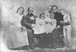 Rafael's son and Manuel's father, Benito Llanza y de Esquivel (1822–1863),[9] initially also served in the army.[10] However, he became known as high official of Ministerio de Instrucción Pública in successive Narváez governments,[11] member of intellectual elite and engaged in disputes with the likes of Pablo Piferrer, Joan Mañé i Flaquer, Francesc Pi i Margall, Manuel Milà i Fontanals and Manuel Tamayo y Baus. Himself he tried his hand in letters[12] and was also co-founder of l’Acadèmia Provincial de Belles Arts de Barcelona.[13] In 1849 he married Maria de la Concepción Pignatelli de Aragón y Belloni (1824-1858),[14] duchess of Solferino and condesa de Centelles, descendant to a family originating from Italy[15] and heiress to enormous land fortune in Aragon. Politically close to the Moderados[16] he probably aspired to political career, thwarted by his premature death.[17]