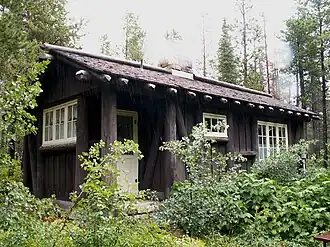 The Many Glacier Campground Camptender's Cabin in Glacier National Park is an example of the National Park Service Rustic style. Built in 1934, the small cabin is significant for its association with park visitation patterns, auto camping, and NPS rustic architecture.