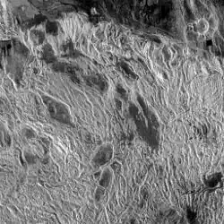 Tesserae are regions of heavily deformed terrain, mostly located on highland areas (greater than 2 km in elevation) on Venus. This tectonic feature -or uni— is thought to be the oldest material on Venusian surface with highest level of tectonic deformation.[17][18] It is of high topography and seen in white on the SAR images with high radar backscatter.[19] The materials composed tessa terrain, which was named as unit Tt in the mapping of V-17(Basilevsky, A. T.,1996).[20]