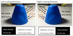 SAR images do not provide the color of surface, only the intensity of reflection of radar waves on the surface at a particular incidence angle. For example, when there is a light source shining on the blue cap on the left (left-looking), there will be shadows on the other side of the cap where light waves are blocked by the cap and no reflection occurs. If the looking direction is changed to the right, the shadowing (dark on SAR image) part will be at the opposite side.