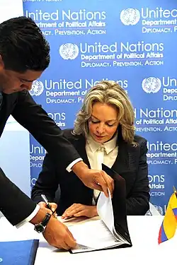 María Emma Mejía Vélez (born 27 September 1953)[1] is a Colombian politician, diplomat, and journalist. She was the Permanent Representative of Colombia to the United Nations in New York. She served as Secretary General of the Union of South American Nations, Minister of Foreign Affairs, Minister of Education, Ambassador of Colombia to Spain, and member of the Foreign Affairs Advisory Commission of Colombia. Mejía Vélez was also a peace negotiator with FARC and ELN armed groups.[2] For over a decade, she held the post of Executive Director to the Barefoot Foundation, a non-profit founded by Colombian singer-songwriter Shakira.[3] Mejía Vélez also ran for vice-president and for mayor of Bogotá.