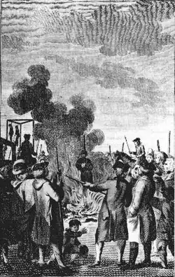 Beddingfield was executed on a Friday, 8 April 1763, in Rushmere, Ipswich, alongside Ringe. Prior to his hanging, Ringe addressed the crowd that had assembled, confessing and giving a lecture on "the snares and pitfalls of wicked women." Meanwhile, Beddingfield was burned at the stake[1] and was probably strangled with a rope as the fire was lit.[12] There was a huge gathering of onlookers.[13]