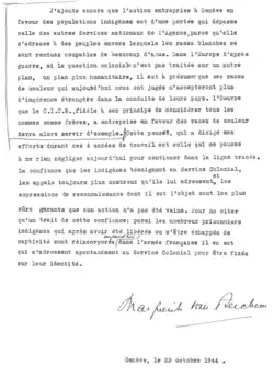 From 1943, she also directed the auxiliary sections of the Agency, which by the end of the war had more than one thousand volunteers in 24 cities across Switzerland.[10] On 23 October 1944 van Berchem wrote to the ICRC member Albert Lombard, asking for permission to continue work despite the fact that contact between the colonial service and its French partner organisations was cut off in autumn of 1944, stating that "the work undertaken in Geneva for indigenous people has an impact beyond that of the other national services of the Agency because it is addressed to people that have been much abused by whites."[11]